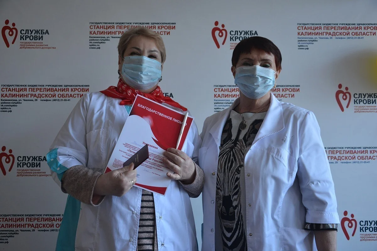 Нагрудный знак «Почетный донор России» 12 виновникам торжества вручила главный врач учреждения Нина Кабанчук. Руководитель станции сообщила, что в настоящее время в Калининградской области насчитывается около 3 тысяч почетных доноров СССР и России.